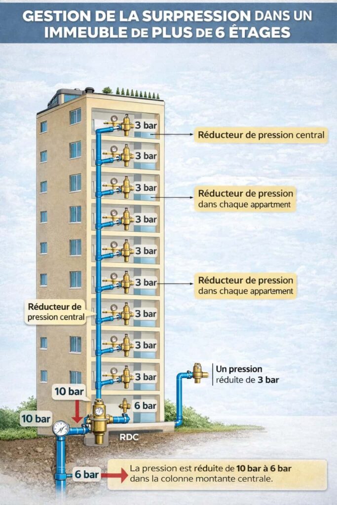 Dans les immeubles d’habitation, hôtels, bâtiments tertiaires ou établissements recevant du public, la pression du réseau d’eau de ville est souvent insuffisante pour alimenter correctement les étages supérieurs. Un système de surpression assure une distribution homogène de l’eau à tous les niveaux, quel que soit l’étage.